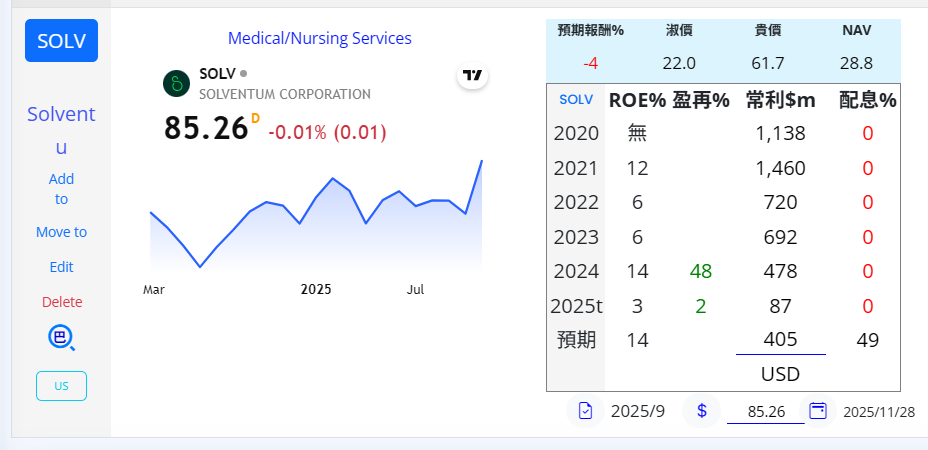 11/25賣出SOLV,這家公司是MMM分出來的醫療材料,貴了賣出。