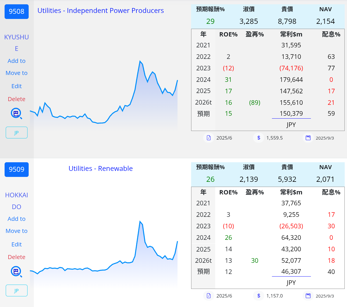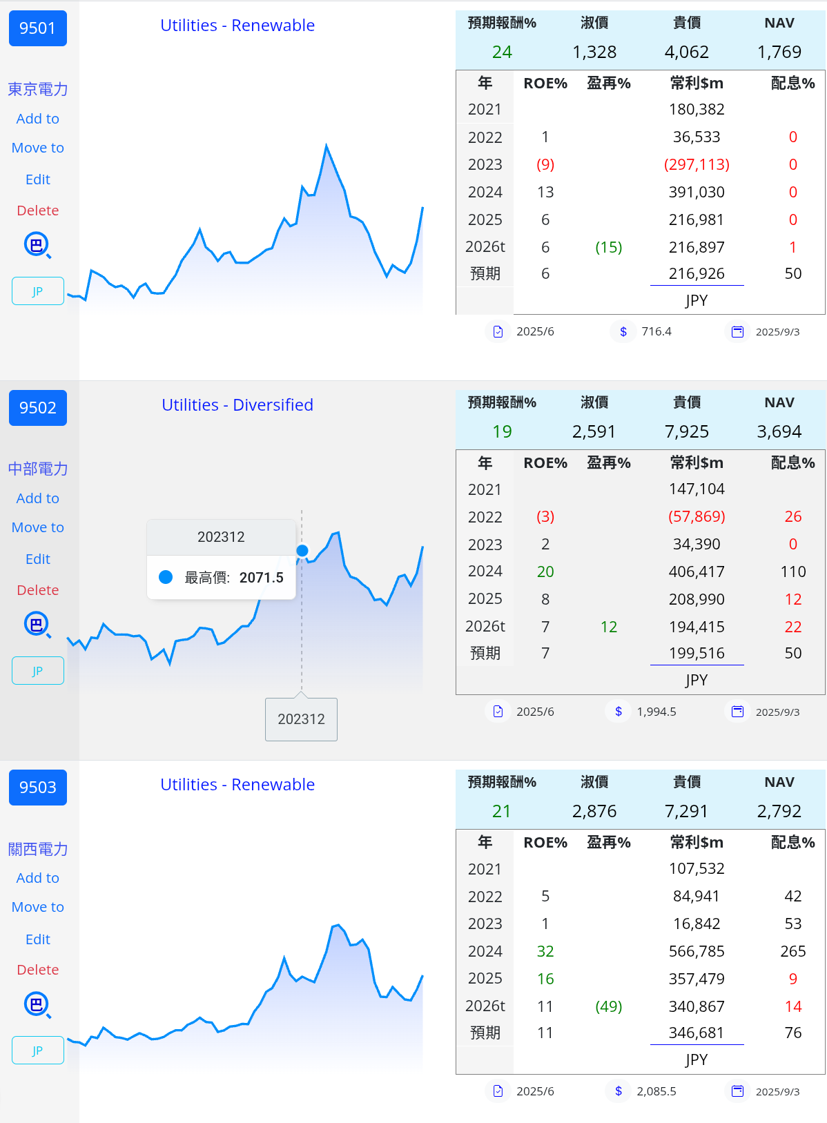 這些公司在日本公用事業領域中具有代表性,且因為其行業屬性多為必要性產業,常被視為價值穩健的投資標的。公用事業股普遍有穩定的現金流和股息回報,適合長期投資配置。