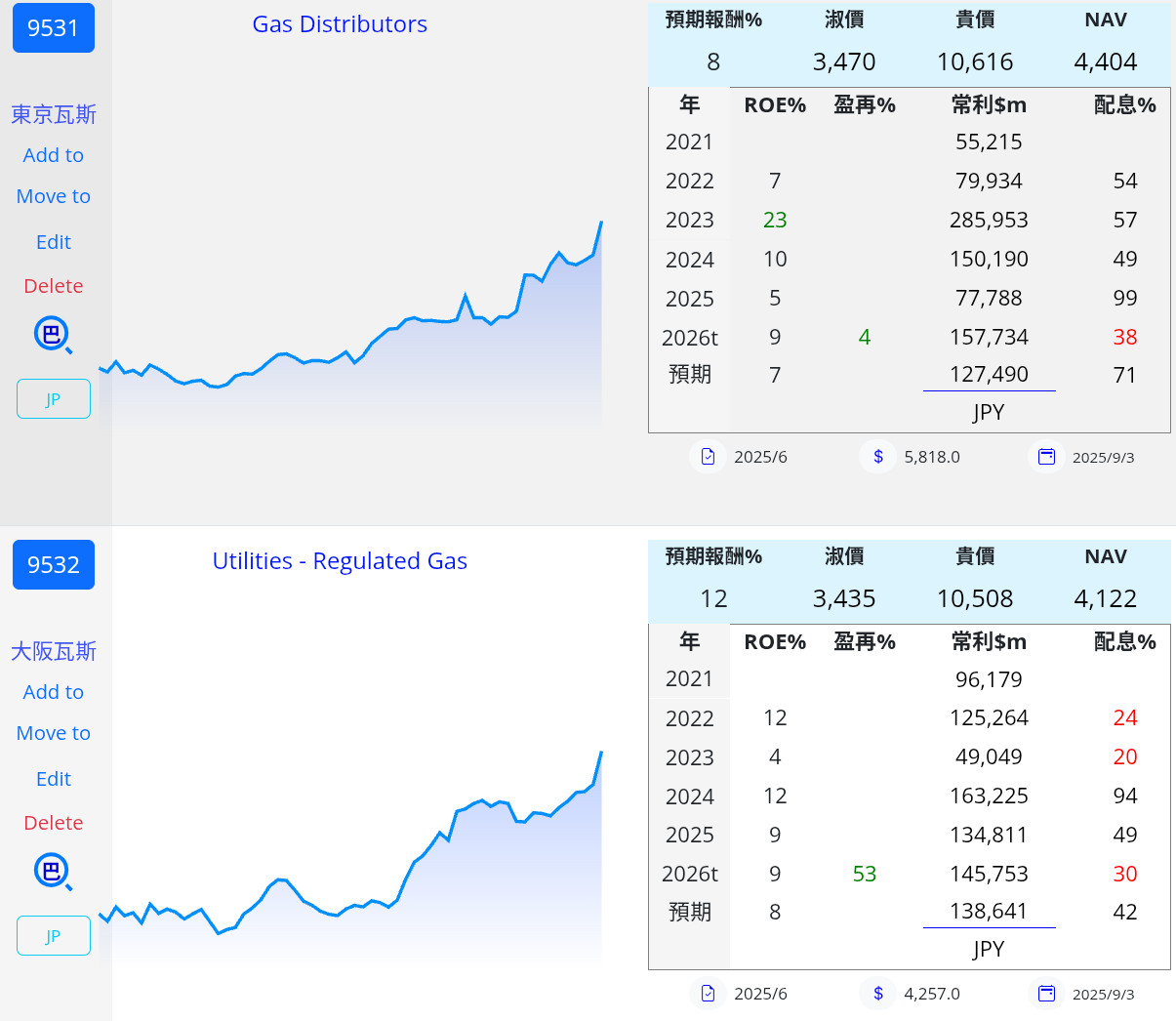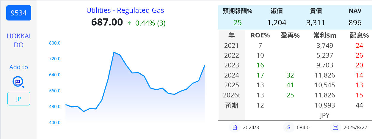 巴班同學早已買進東京瓦斯9531,但逐漸變貴了...