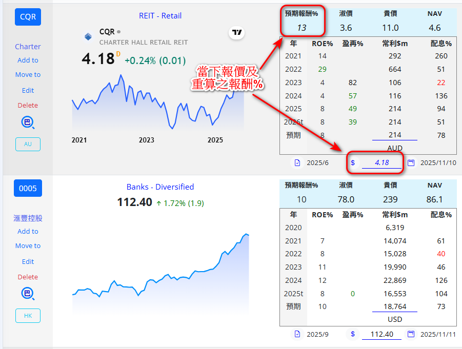 Watchlist 新增 以載入網頁時的報價(藍字&斜體) , 自動計算預期報酬率(斜體)