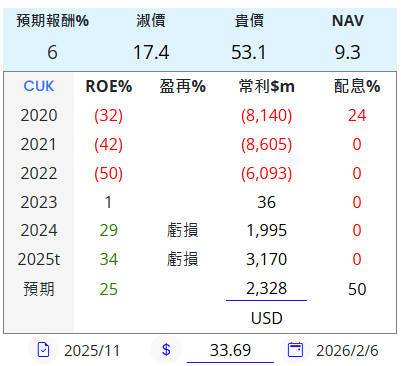 盈再表計算此種公司預期常利可能低估,恐誤判已達貴價而過早賣出,因此手動調高試算 (例如: CUK可採用疫情前2019年常利$29.89億代入)。