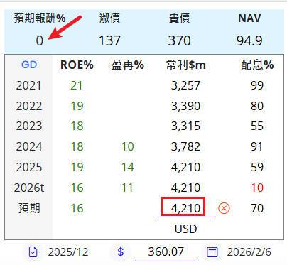 3. 假設以更樂觀狀況: 預期常利採近5年最高值 2026t $42.1億 代入,試算出預期報酬率仍然0%(如下 截圖2)。