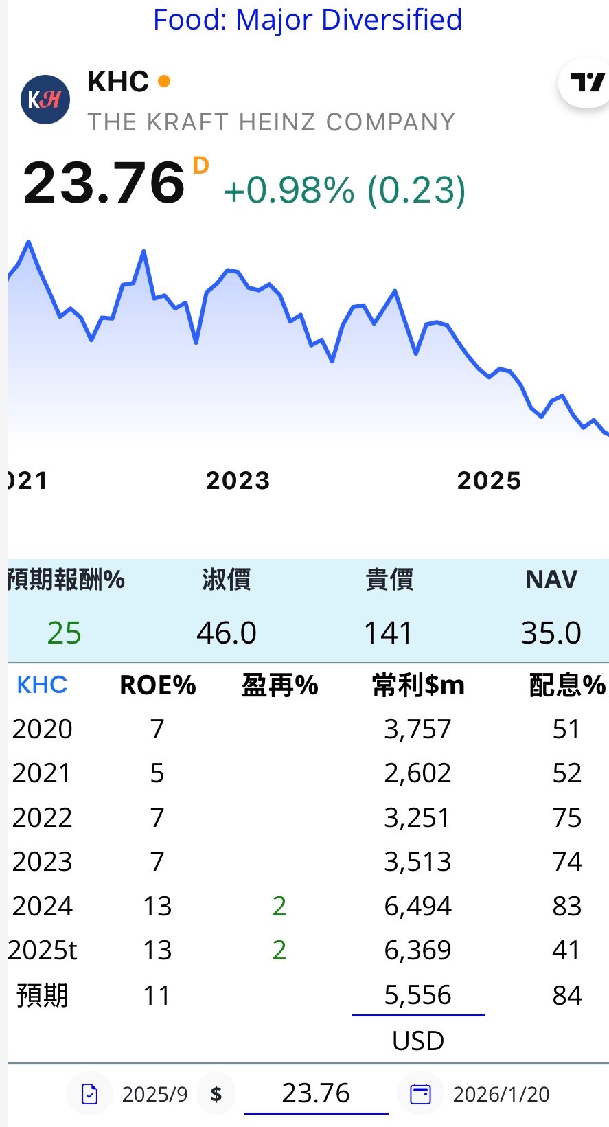 KHC 2020/3/26 買在23.2,年複利僅4%,盈再表看起來不錯,也就一直擺著。