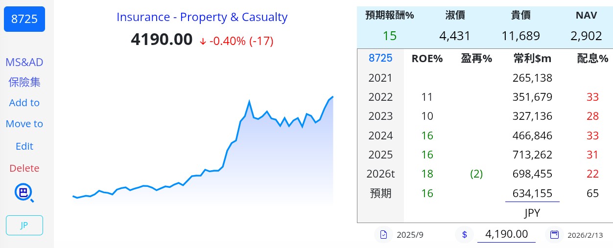 防禦性與成長性兼具: 在市場動盪時,保險股具備防禦特質;而東京海上的海外擴張則提供了優於同業的成長性。其 P/B Ratio (股價淨值比) 通常高於同業 (約 2.0倍 vs 同業 1.0~1.2倍),這反映了市場給予其「高品質溢價」。