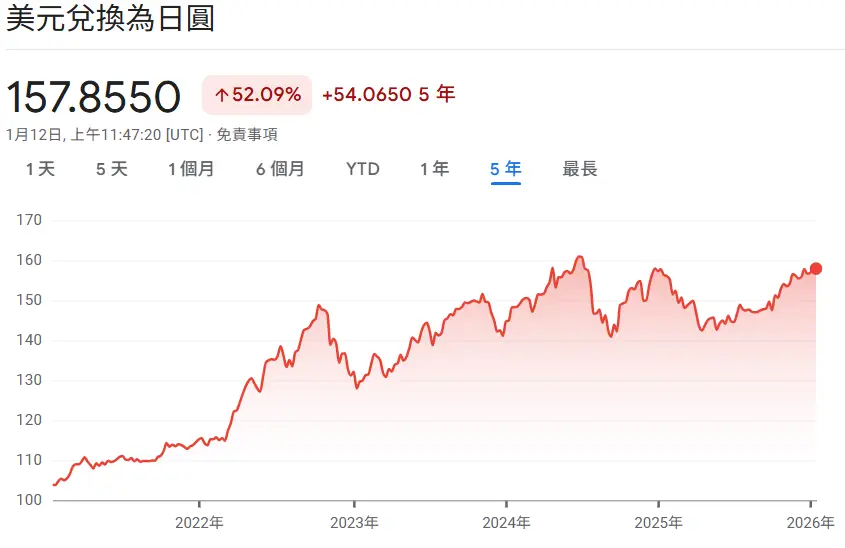 是因為美元兌日圓過去五年來漲了52.09%