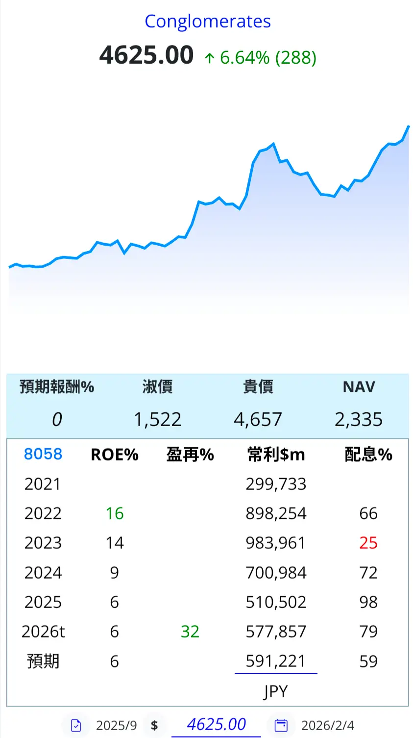 三菱商事(8058.T)於今日(2026 年 2 月 5 日)股價表現強勁,漲6.64%,收在 4,625 日圓 的歷史新高。