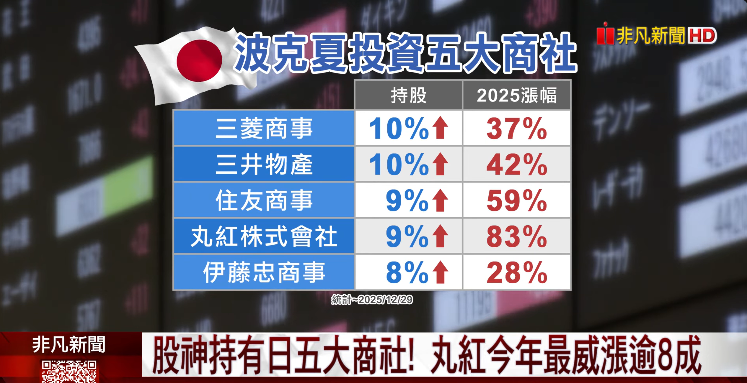 伯克希爾的13F報告(截至2025年6月30日)和股東信顯示,日本部位僅限於這五大商社,總市值約235億美元,佔其股票組合約9%。無提及其他日本公司或板塊(如科技、金融或房地產)。