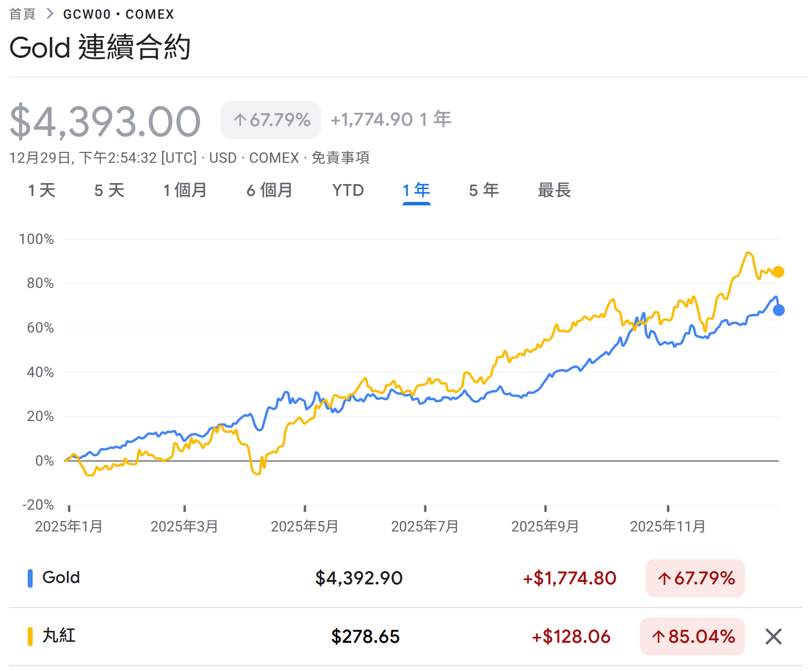 Google財經 (2025年 黃金期貨 +67.78% ; 丸紅 +85.04%)