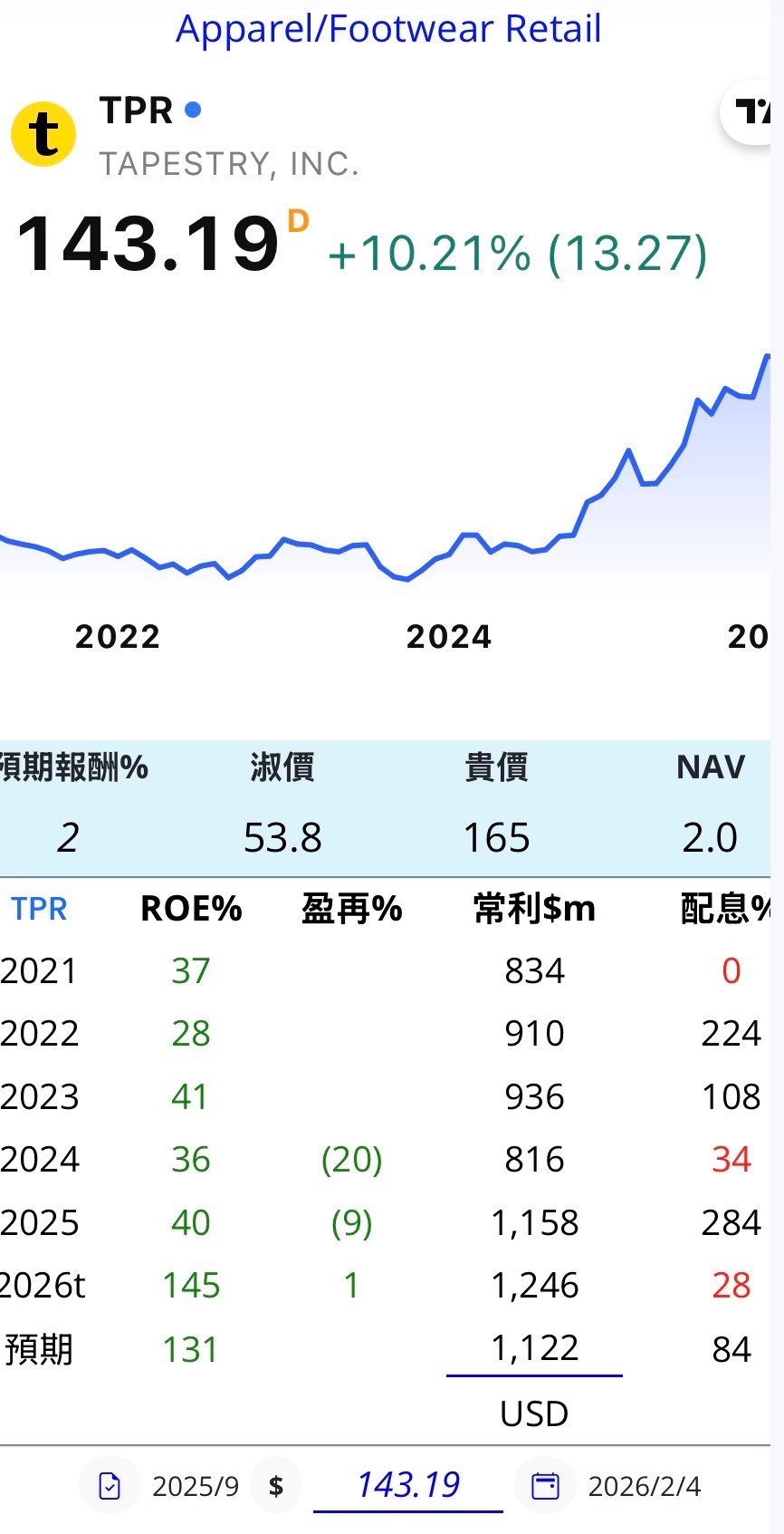 除上述四個公司之外,Coach 母公司 Tapestry 集團今年來累計上漲 16.25%。