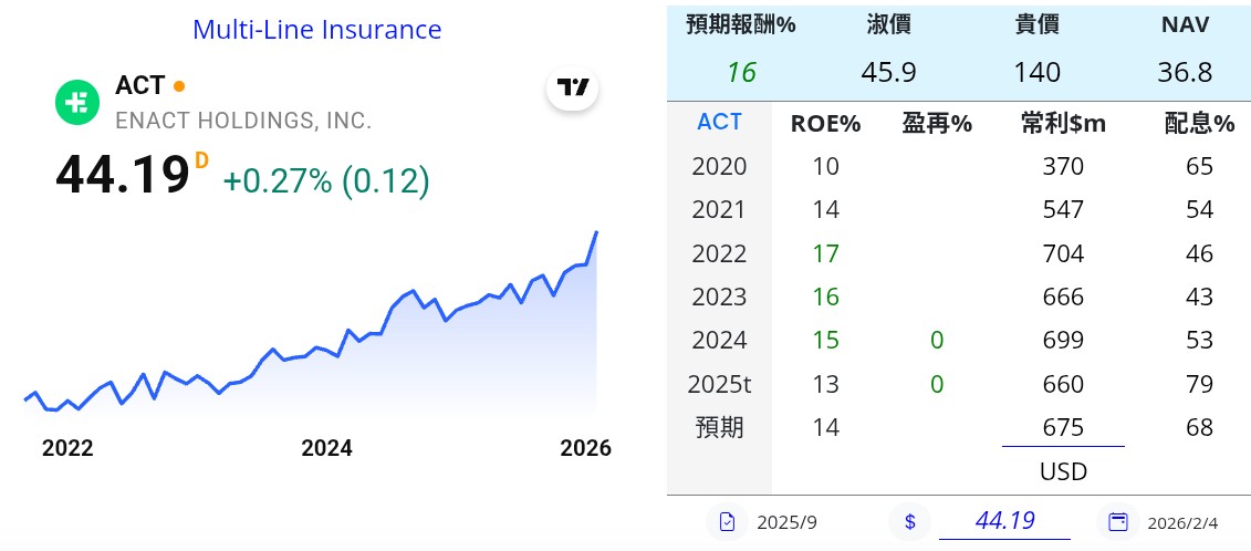 儘管營收略遜於預期,但 ACT 在獲利能力 (EPS) 和風險管理 (Loss Ratio) 上表現非常出色。這反映出在房貸利率波動的環境下,該公司仍能保持穩定的利潤邊際與強勁的現金流回饋股東。