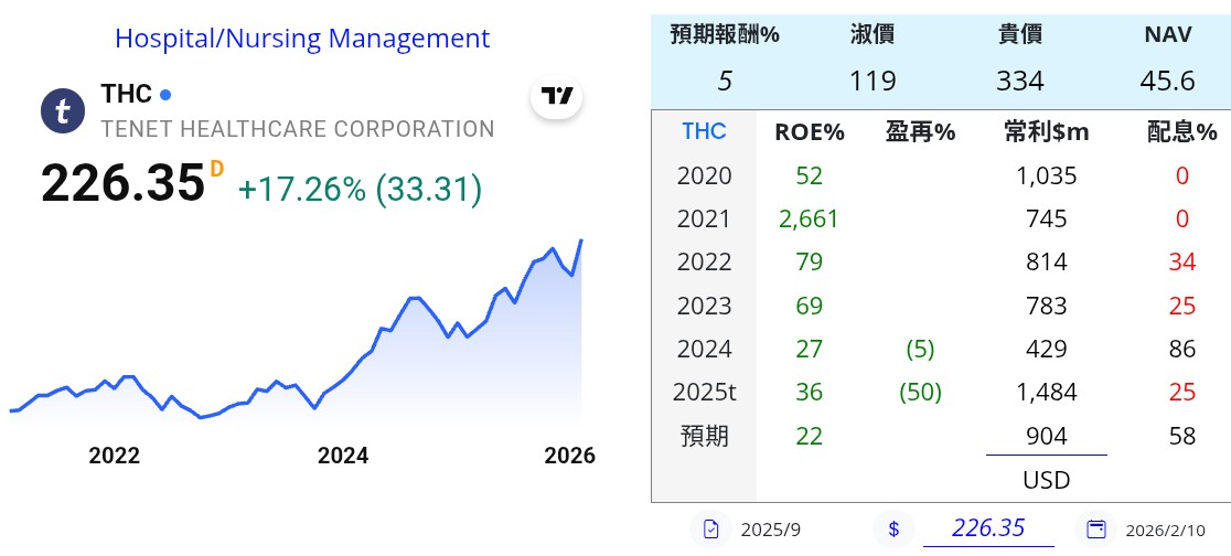 2026 財務指引 (Guidance): THC 給出了樂觀的 2026 全年展望,預期 調整後 EPS 將落在 $16.19 至 $18.47 之間(市場平均預期約為 $17.33),顯示公司對未來獲利能力充滿信心。
