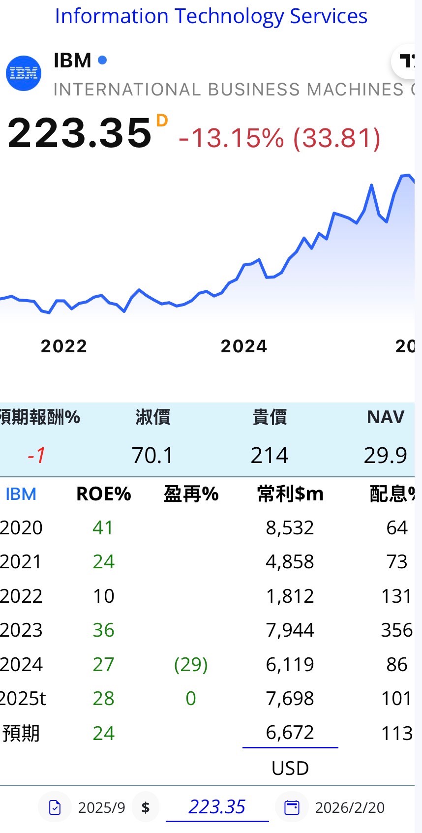 - IBM股價周一暴跌後,今年累計跌幅超過24%,遠低於去年11月的52週高點(約314-325美元區間)。