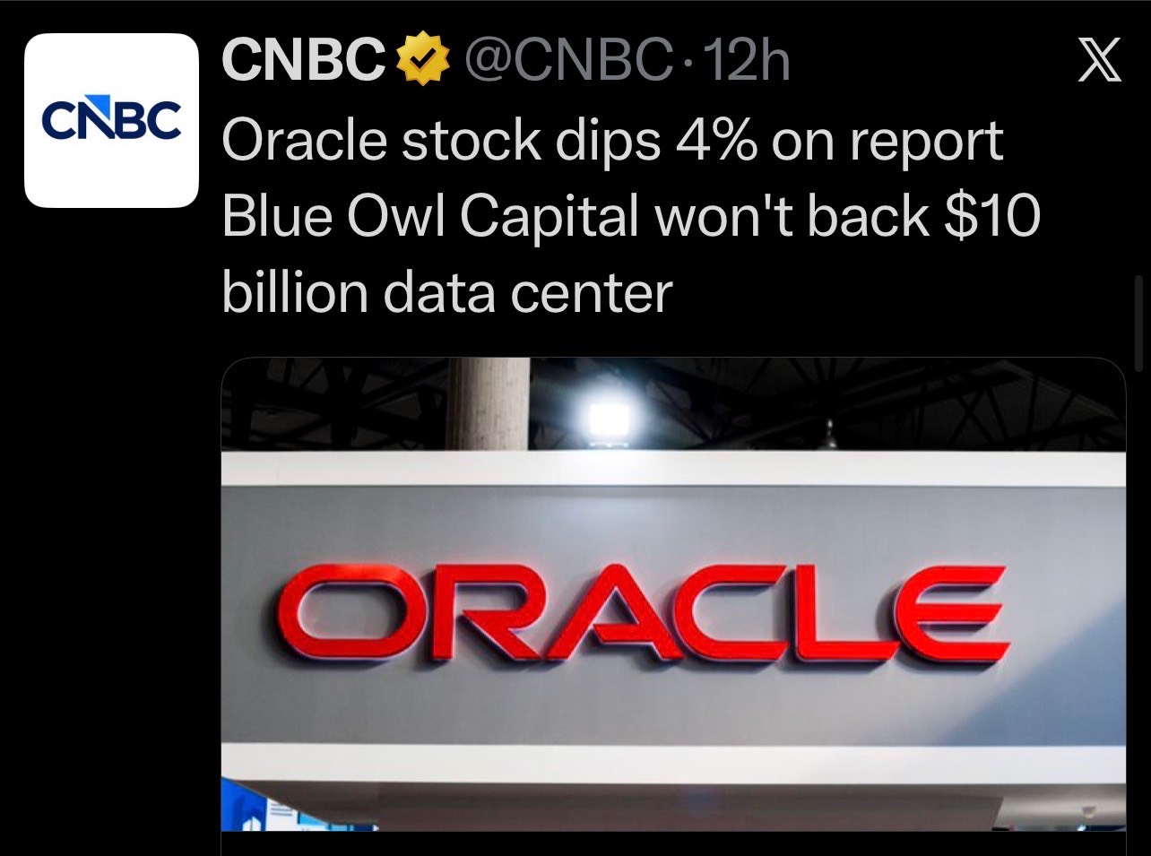 甲骨文(Oracle)股價因報導下跌 4%,藍貓頭鷹資本(Blue Owl Capital)不會支持 100 億美元的資料中心投資