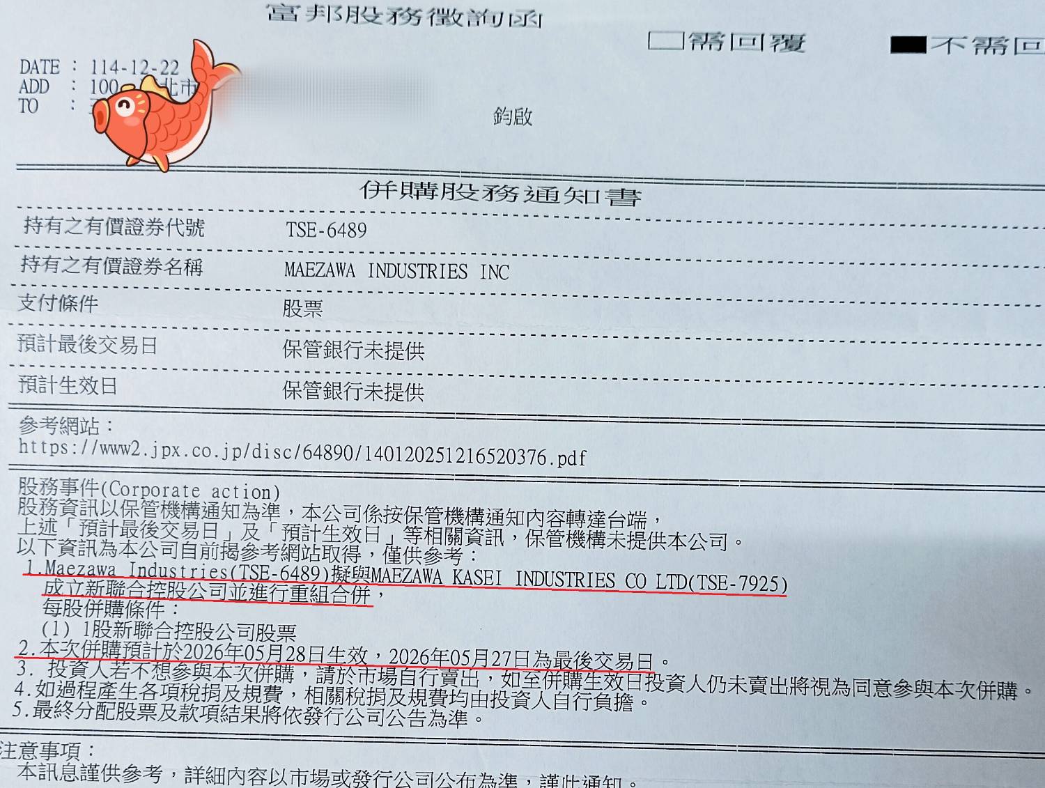 收到富邦併購股務徵詢函(Date:114/12/22),日股6489(前澤工業)與7925(前澤化成工業)進行重組合併,看了盈再表及新聞,擬繼續持有(114/2中下旬購入,迄今約55%獲利)。謝謝chunhsieh同學介紹這家公司。