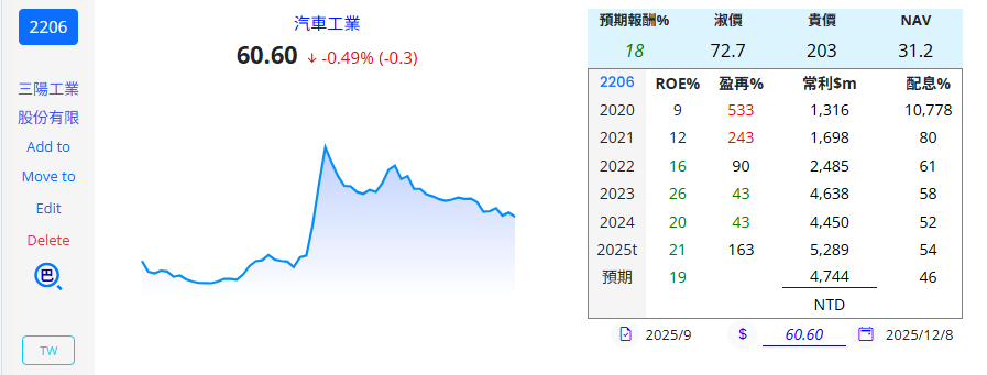 4. 營運改革與效率優化:自2014年董事長吳清源上任後,聚焦核心機車業務,優化財務結構。儘管代理HYUNDAI汽車受關稅與市場不振影響(2025年前五月四輪銷售拖累營收),但機車貢獻逾80%獲利,下半年預期追回。整體ROE從2022年的18.56%升至2023年的29.2%,顯示改革成效。 總體而言,三陽工業在車市寒冬中靠機車「二輪稱霸」突圍,未來外銷與電動化將持續推升動能。但需留意全球經濟與競爭風險,如中國機車進口壓力。投資前建議參考最新法說會或財報。
