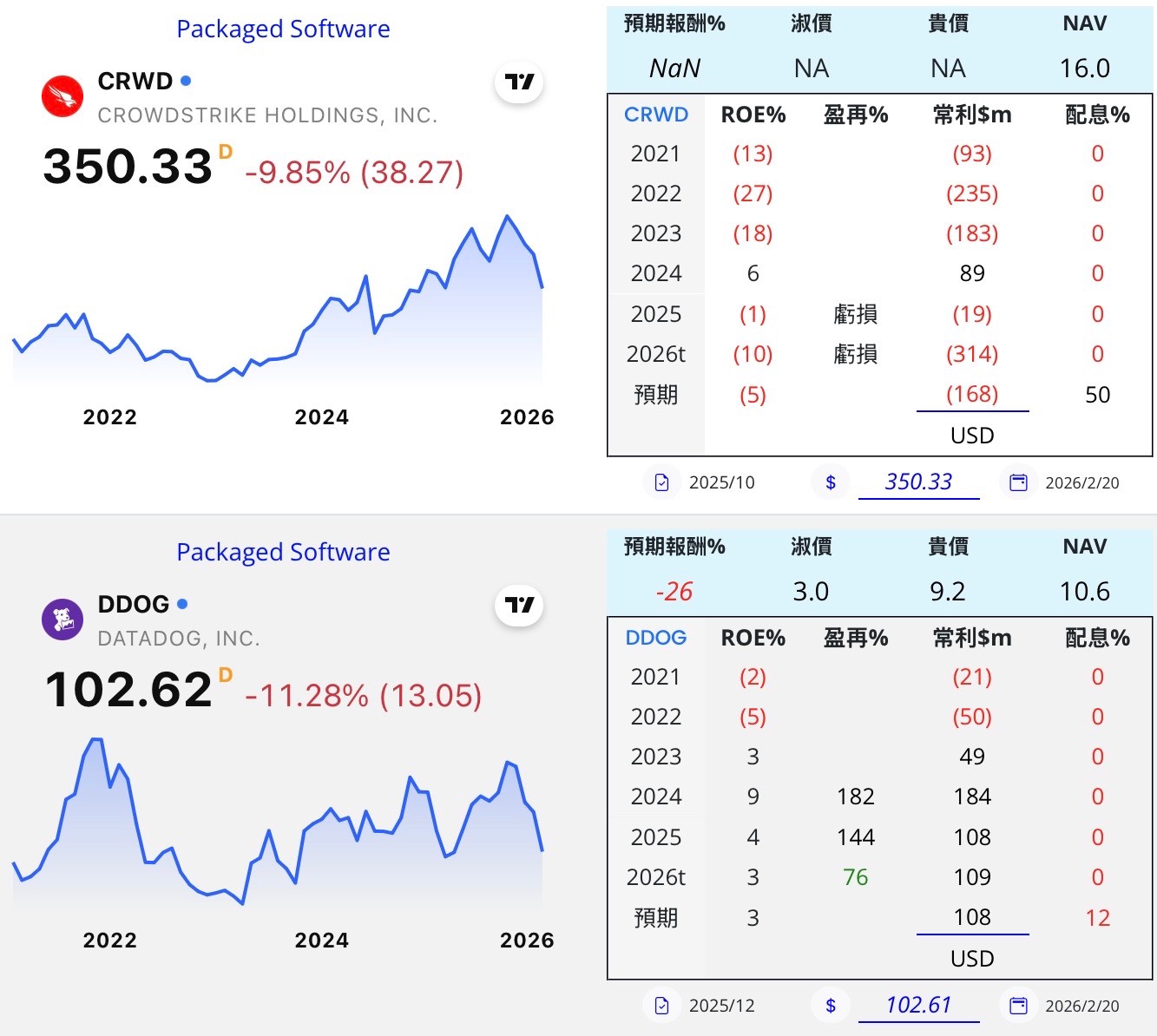 - 更廣的軟件股如 Salesforce、Adobe、ServiceNow、Workday、DocuSign 等普遍跌6-11%
