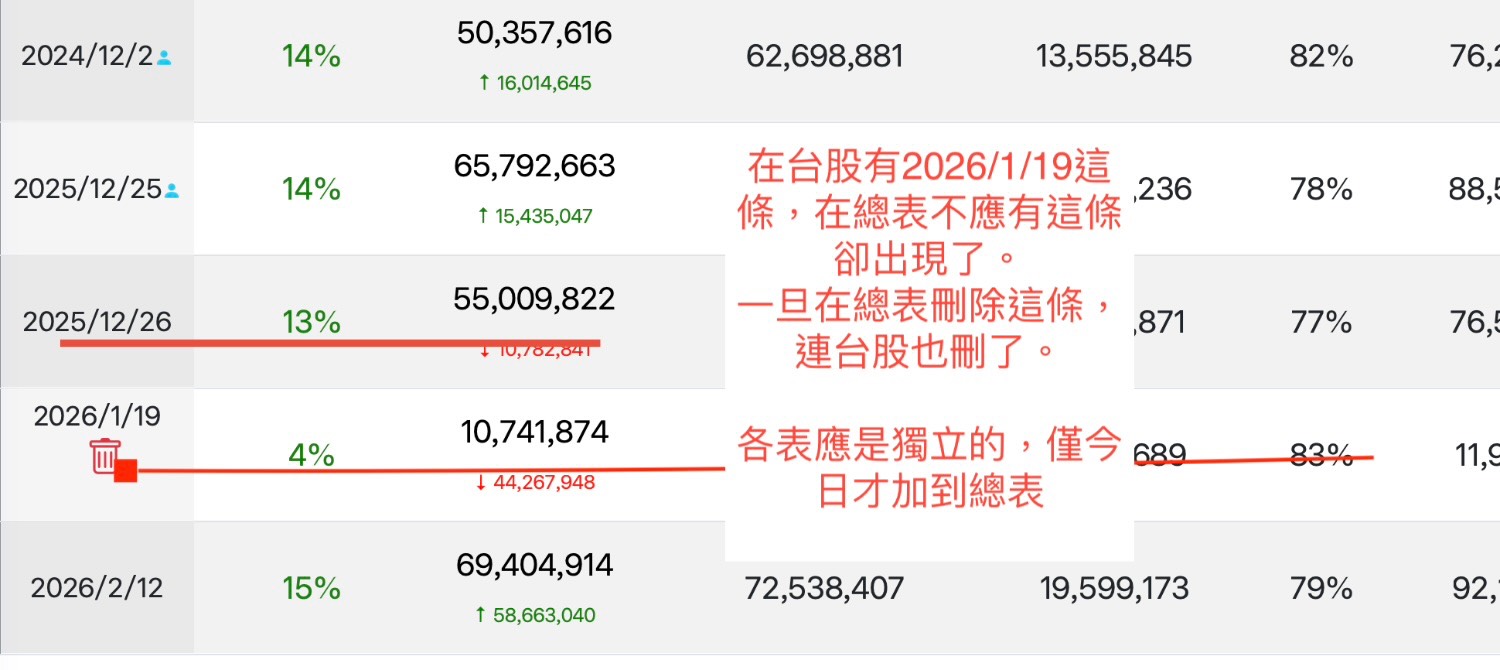 把總表這二列刪除連帶美股和台股也被刪除,為何連動?