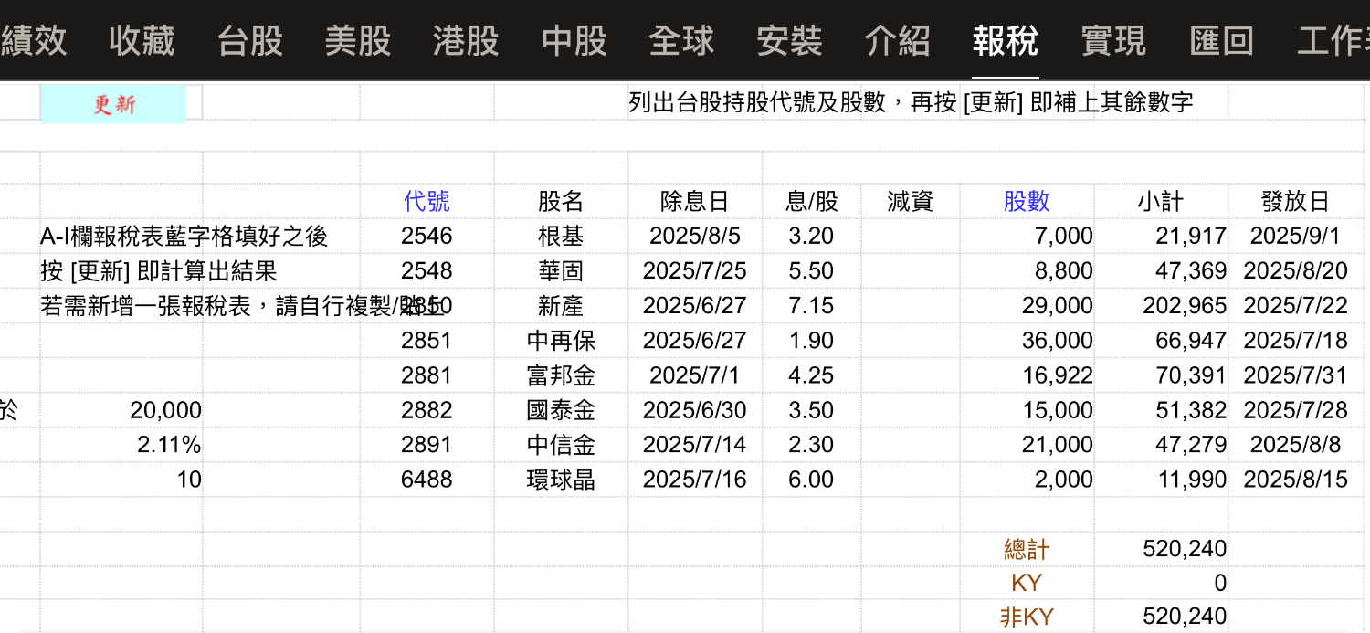 在Excel版報稅頁右邊有台股配息表也是必備的一張表